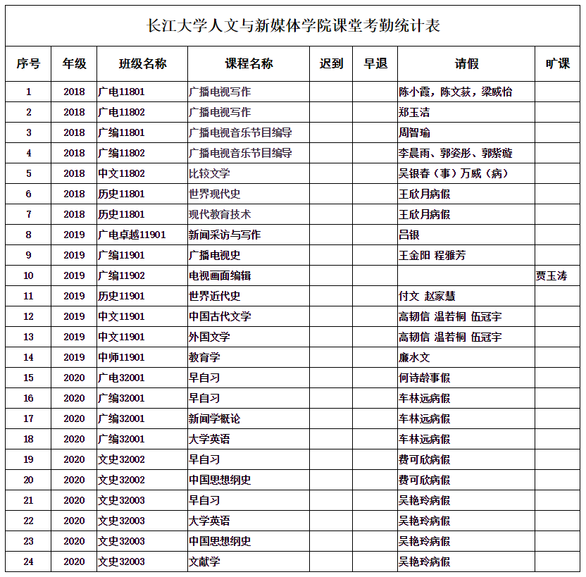4月21日,suncitygroup太阳集团组织学生干部对18、19、20级30个班的24门课程进行69次课堂考勤,100%到课率45次,现将考勤结果公布如下: