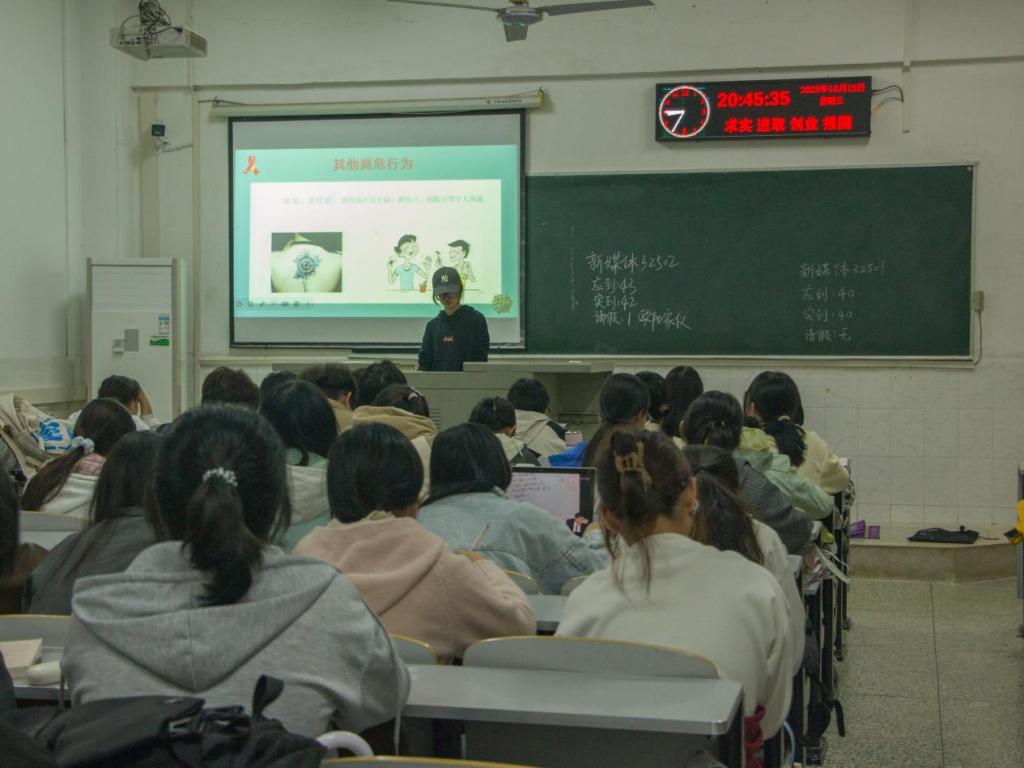 班会以“大学生活,从‘心’出发”为主题,围绕心理健康知识科普、新生常见心理困扰剖析、学校心理咨询服务介绍以及心理健康活动设计等方面展开。主讲人结合详实的案例,深入浅出地分析了新生在进入大学后可能面临的诸如环境适应、人际交往、学业压力等心理问题,并针对性地提出了一系列实用的应对策略,如情绪调节方法、时间管理技巧以及积极的自我暗示等;同时,本次班会还就“大学生性行为健康”与“HIV防治”相关知识进行分享,重点讲解了核心预防措施,提醒同学们既要做好生理防护,也要关注心理状态调节。